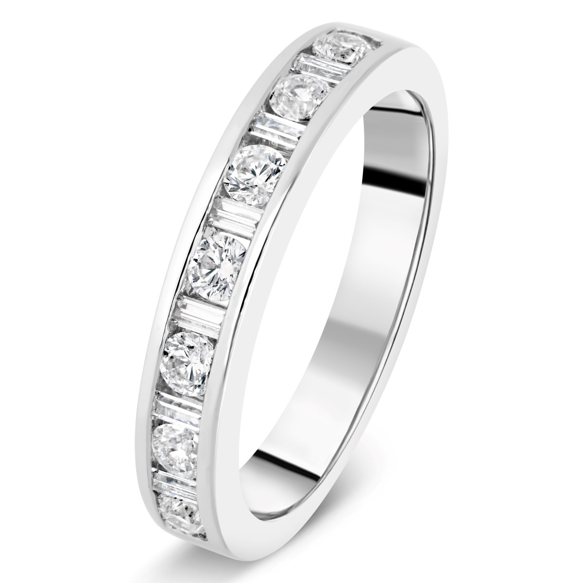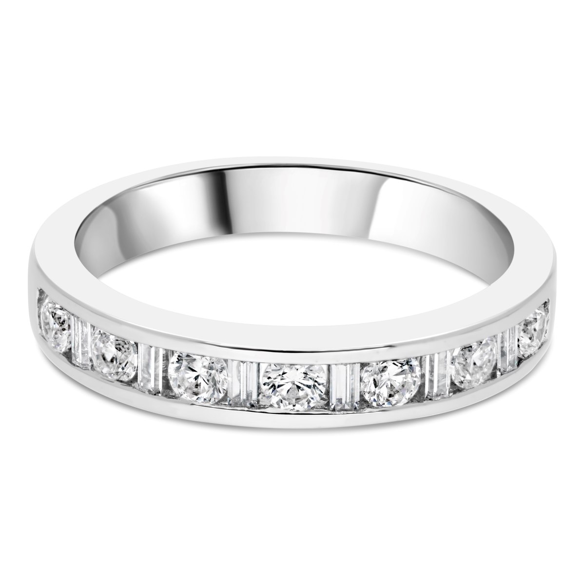 Cette alliance demi-tour en or blanc 18 carats se distingue par son design raffiné et lumineux. Les diamants ronds alternent avec des baguettes disposées en séquence répétée, créant un motif harmonieux et moderne qui capte la lumière à chaque mouvement.