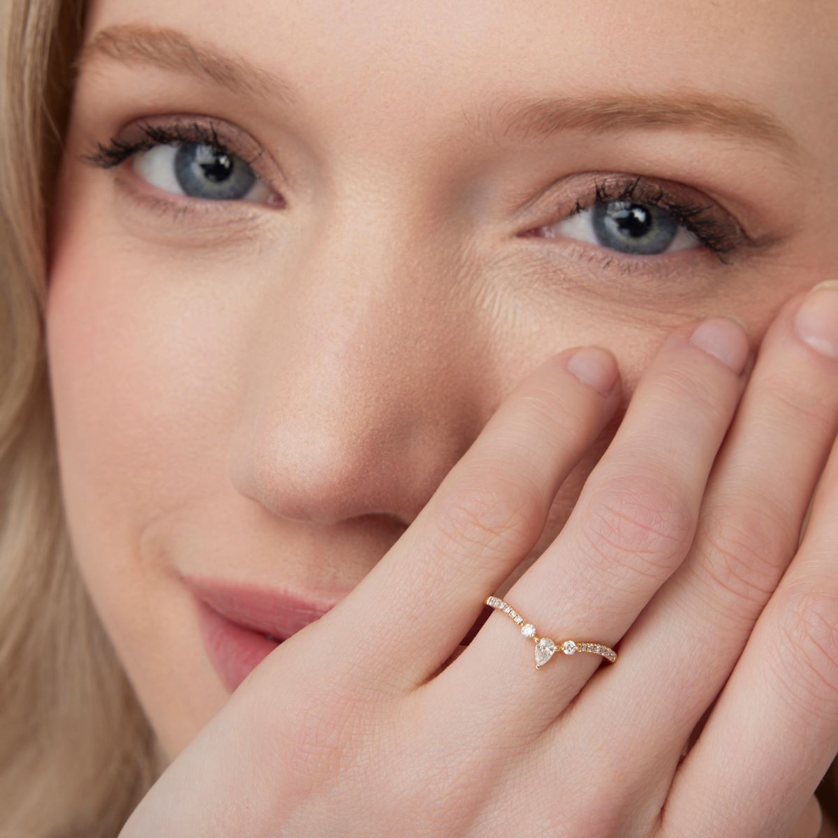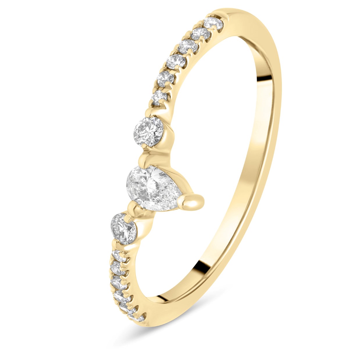 Délicate et charmante, l’alliance La Tiara en or jaune 750 millièmes présente un diamant en forme de poire au centre, entouré de diamants ronds sertis en demi-tour.