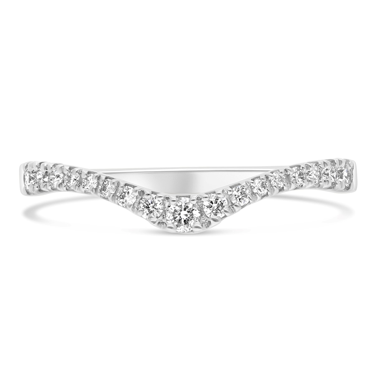 Notre alliance en demi-tour diamants est incurvée en forme de pointe de cœur pour s'associer avec votre bague de fiançailles. Cette version est réalisée en platine 950 millièmes et elle est disponible aussi en or 18k.