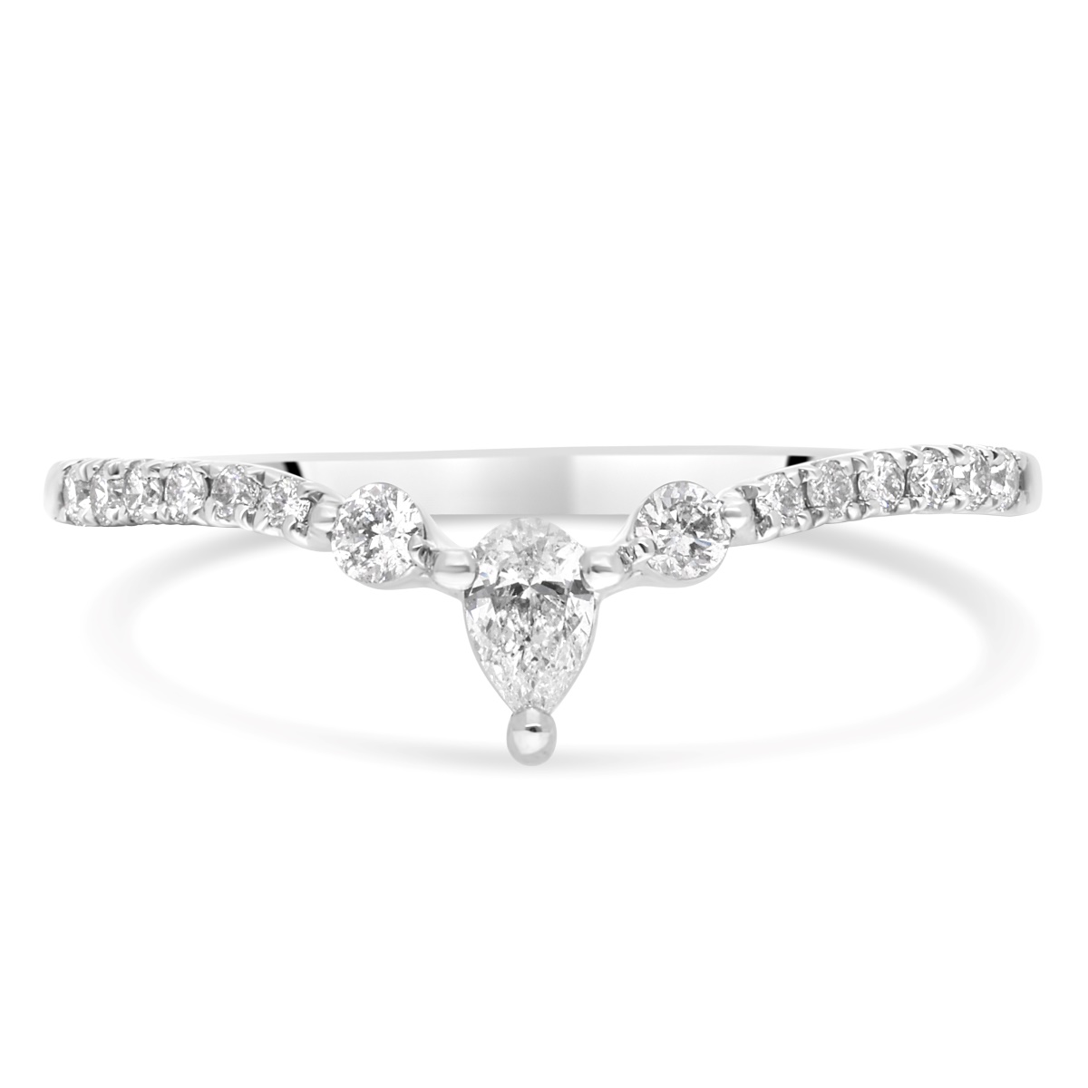 Délicate et charmante, l’alliance La Tiara présente un diamant en forme de poire au centre, entouré de diamants ronds sertis en demi-tour.