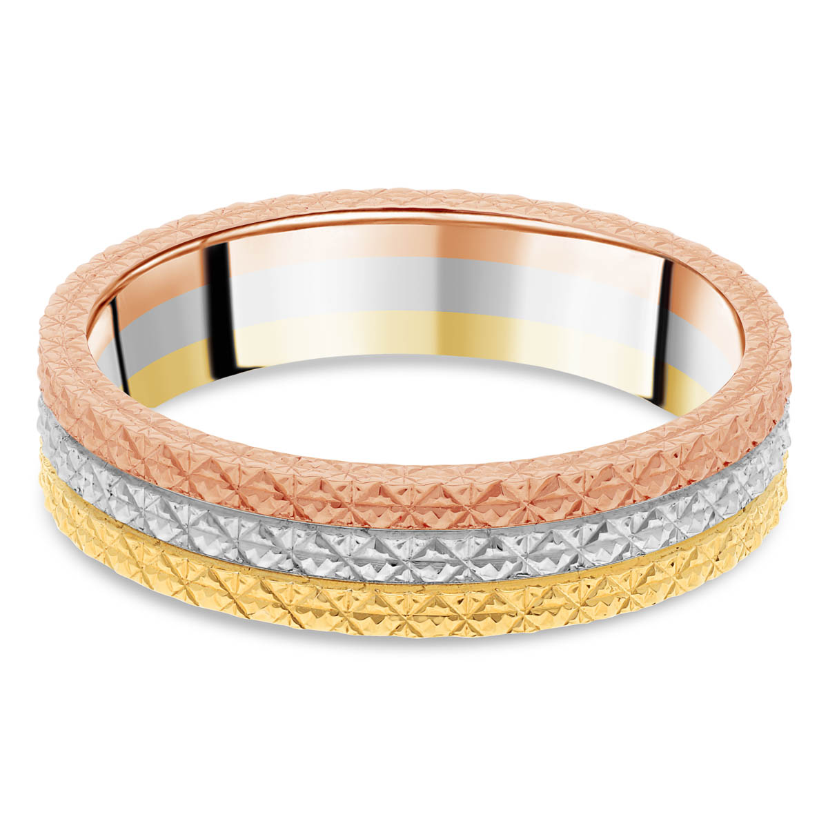 Une alliance de mariage contemporain pour femme, composée de trois anneaux, en platine, or jaune et or rouge 18 carats, soudés côte à côte. Les anneaux sont ornés d'un motif diamanté. Les dimensions de la bague: 4,5 mm la largeur et 1,3 mm l'épaisseur.