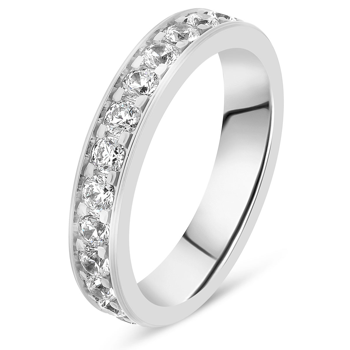 Magnifique alliance de mariage pour femme en or blanc, avec diamants taille brillant de qualité HSI, tour complet serti rail grain. Existe en plusieurs versions de 0.50 à 2 carats. L'intérieur est massif pour permettre la gravure et arrondi pour plus de confort.