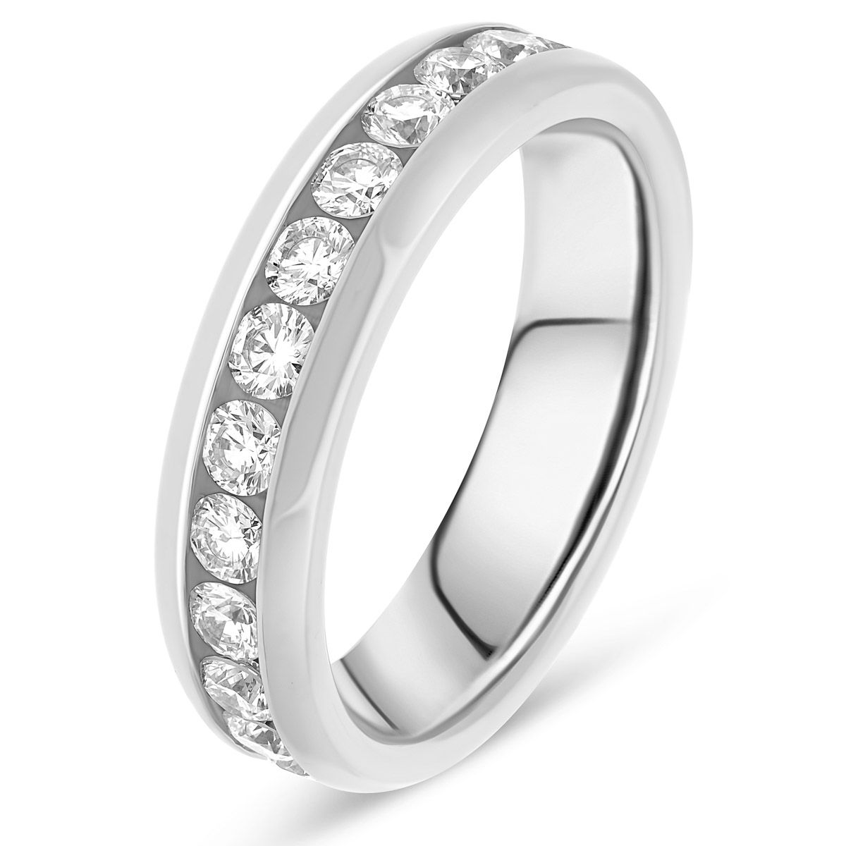 Importante alliance de mariage pour femme en or blanc, avec diamants taille brillant de qualité HSI ou GVS, tour complet serti rail large. Existe en plusieurs versions de 0.50 à 2 carats. L'intérieur est massif pour permettre la gravure et arrondi pour plus de confort.