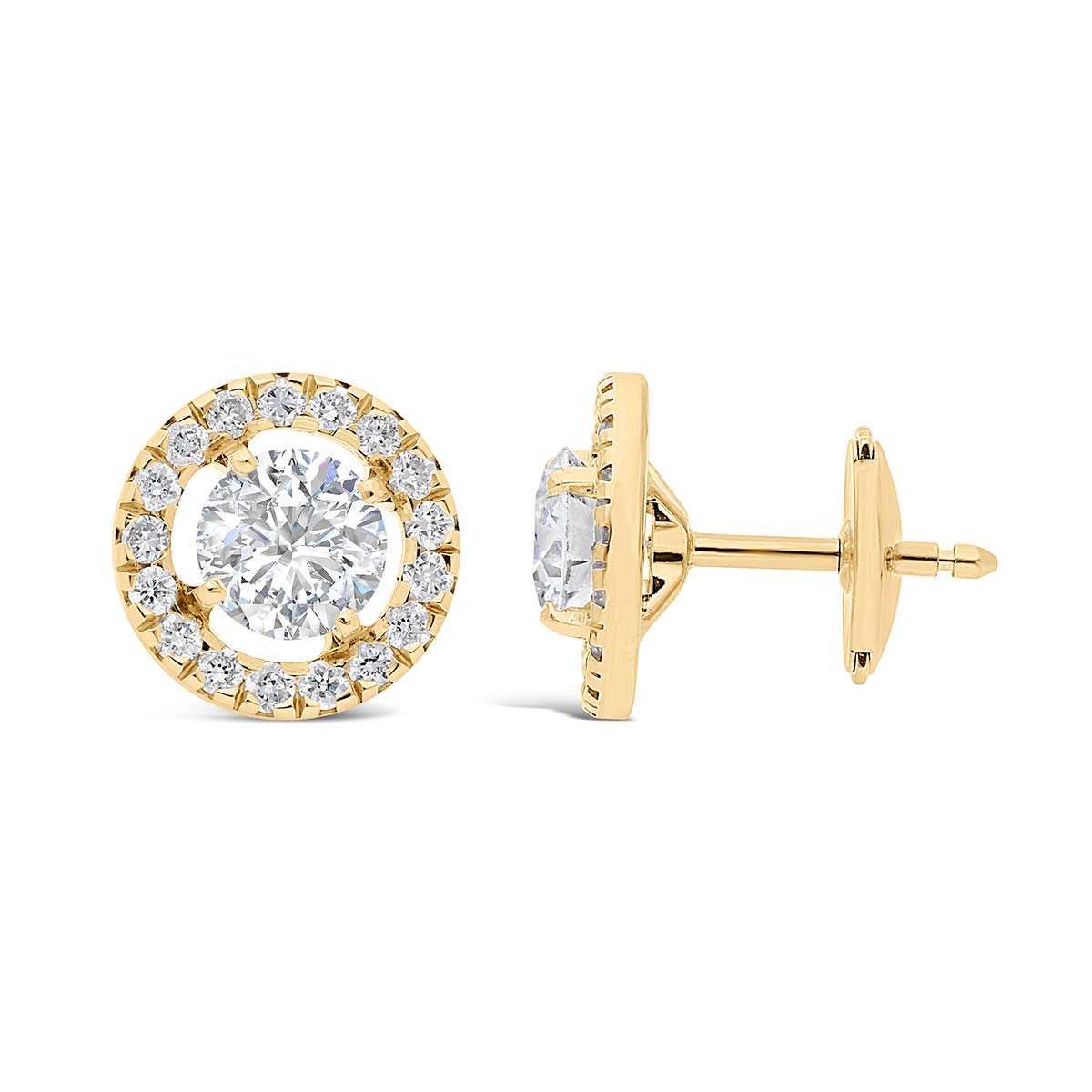 La monture en or jaune 18 carats avec entourage en diamants HSI de 0,15 carats. Le diamètre varie est de 7,4 à 8,6 mm en fonction du poids du diamant de centre.