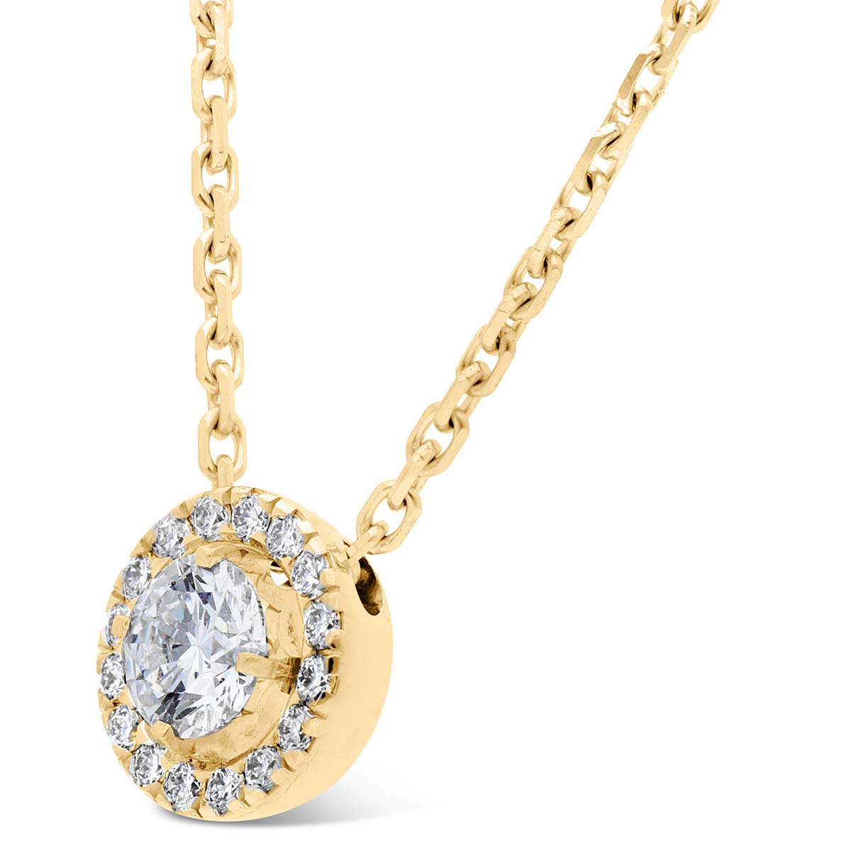 La monture en or jaune 18 carats avec entourage en diamants HSI de 0,15 carats. Le diamètre varie est de 8 à 9 mm en fonction du poids du diamant de centre.