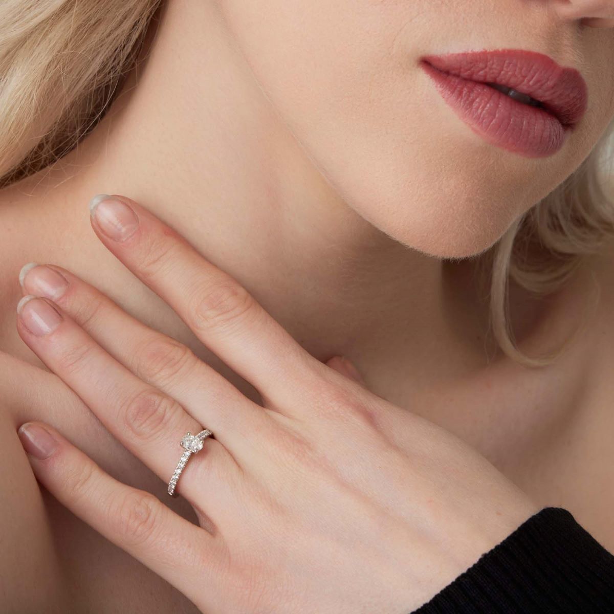 Le diamant central de la bague « Rangiroa » est taillé en ovale qui, grâce à sa forme allongée et ses facettes brillantes, capture la lumière avec une intensité exceptionnelle. L'anneau est serti de petits diamants ronds sur la moitié de son tour, ajoutant une touche de brillance.