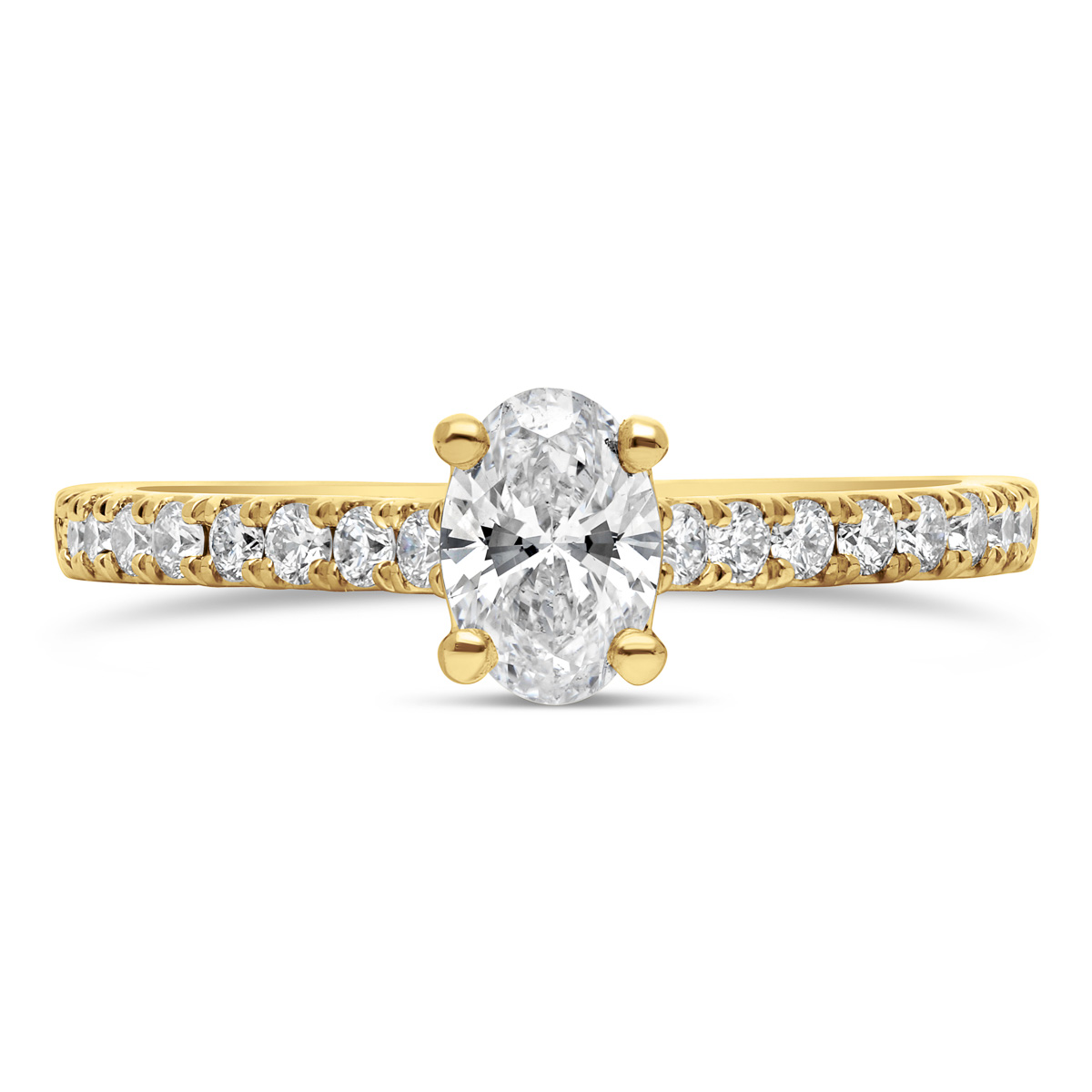Cette bague de fiançailles somptueuse est ornée au centre d’un diamant ovale, accompagné par de petits diamants sertis sur la moitié de son tour. L’ensemble équilibre la simplicité et l'opulence, en offrant un scintillement subtil lorsque la bague bouge.