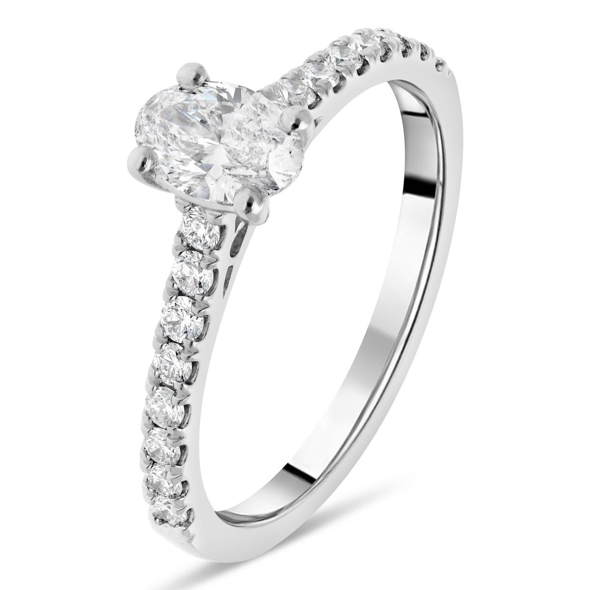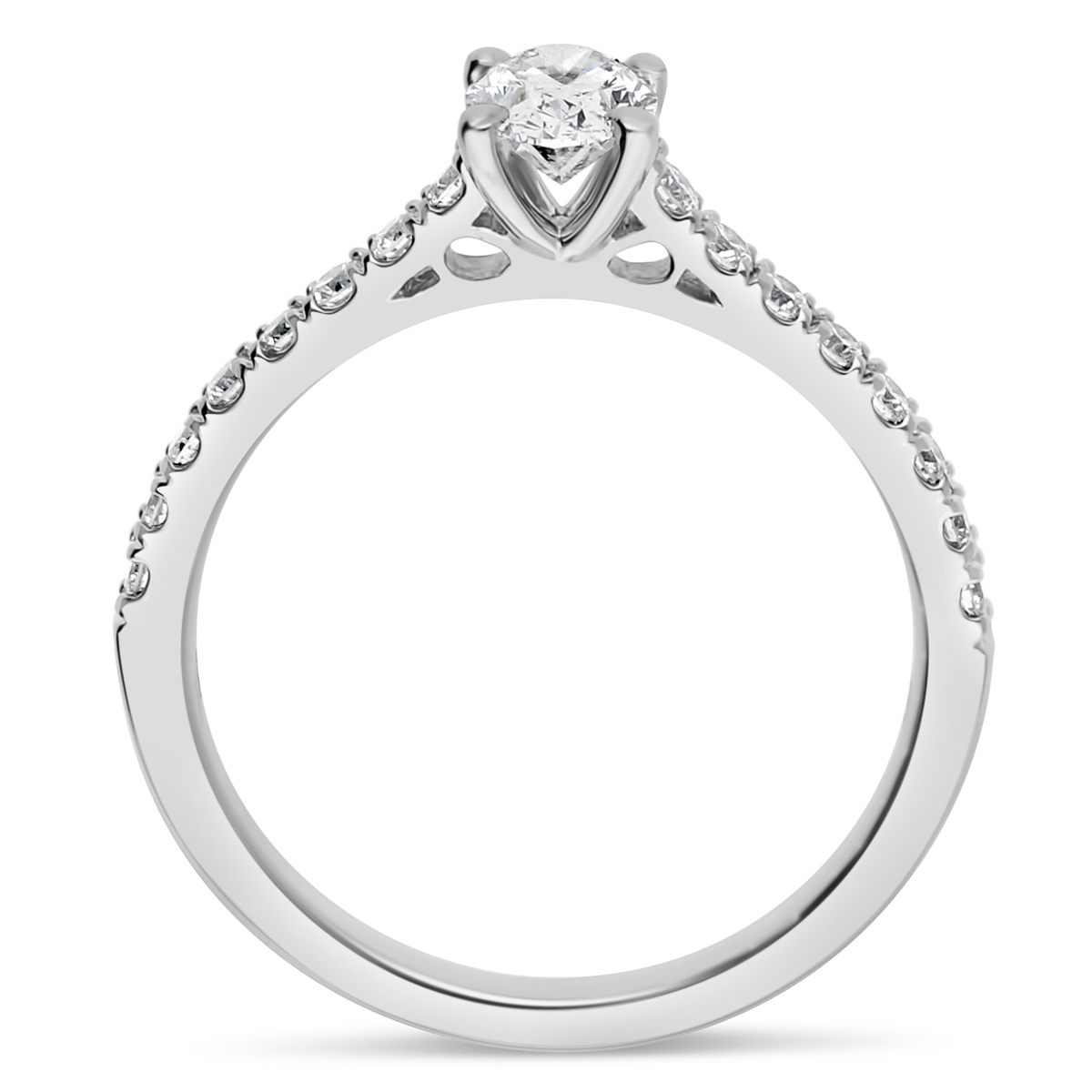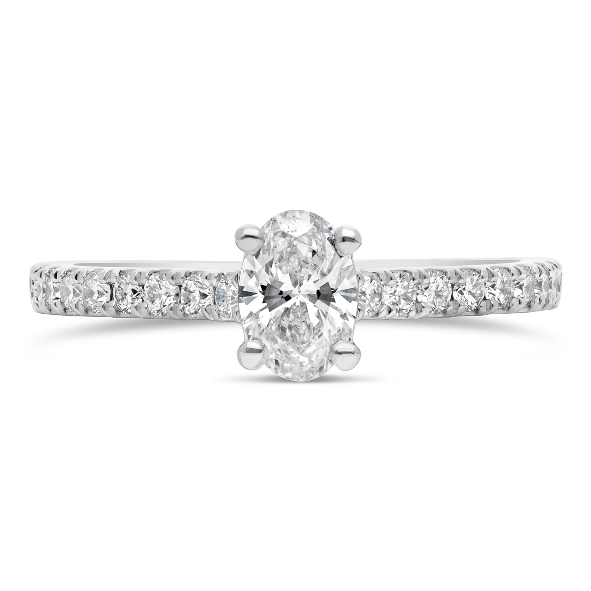 La bague de fiançailles « Rangiroa » présente un diamant central taillé en ovale, serti par quatre griffes. Ce sertissage minimaliste permet à la pierre d'occuper toute l'attention. L'anneau en platine est serti de petits diamants ronds en pavé sur la moitié de son tour, ajoutant une touche de brillance sans détourner l'attention de la pierre centrale.