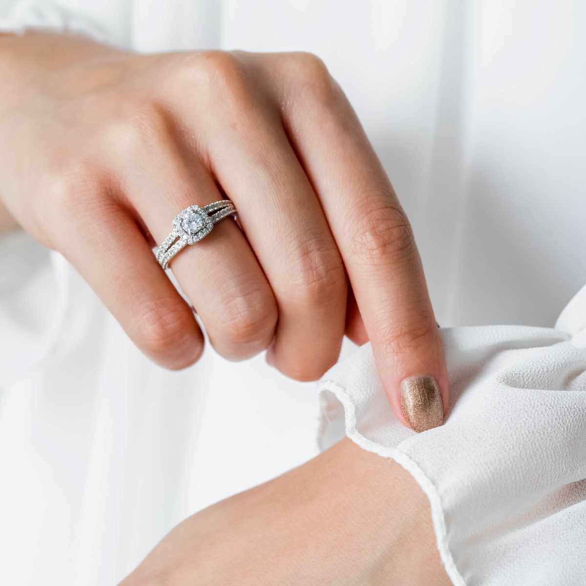 Sur les photos, notre mannequin porte le modèle Rhodes serti d'un diamant de 0,70 ct et de 0,30 ct.