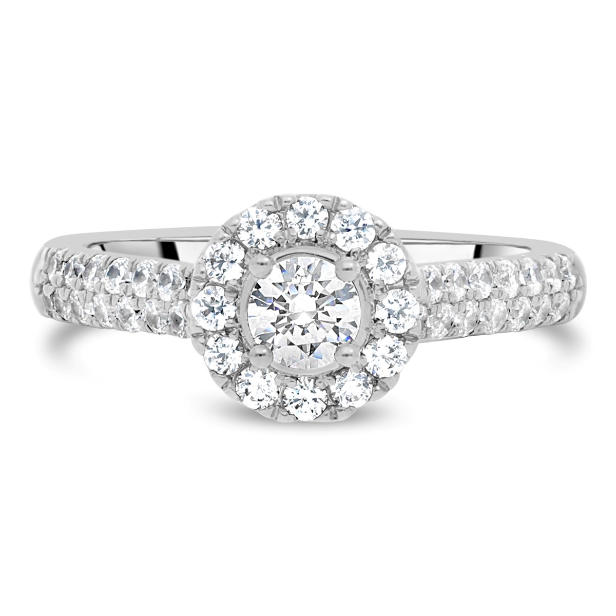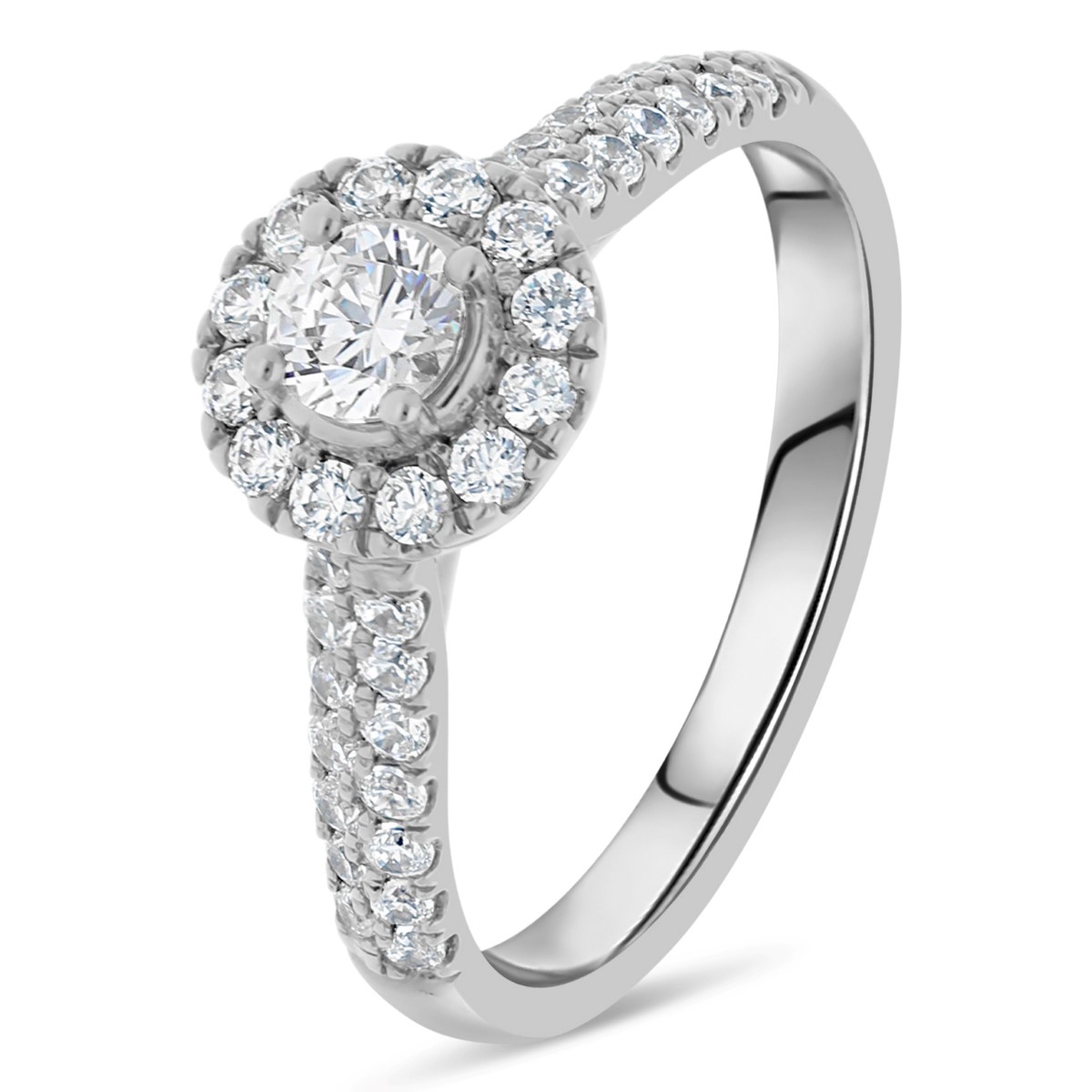 Bague de fiançailles ornée d'un diamant de 0,20 carat HSI maintenu par 4 griffes et entouré de diamants sertis en mini griffes. La partie supérieure de l'anneau est parée de petits brillants sertis sur deux 2 rangs. Le diamètre au centre est de 8 mm. La largeur de l'anneau est de 2,7 mm.