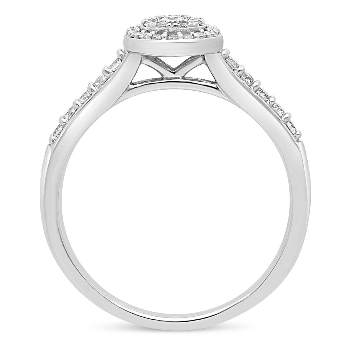 Une bague de fiançailles en or 750 millièmes (18 cts) composée d'un pavage de diamants en forme de poire au centre (la longueur de 9 mm) et d'un accompagnement en diamant sur l'anneau. Les diamants au poids total de 0,36 cts sont sertis en mini griffes.