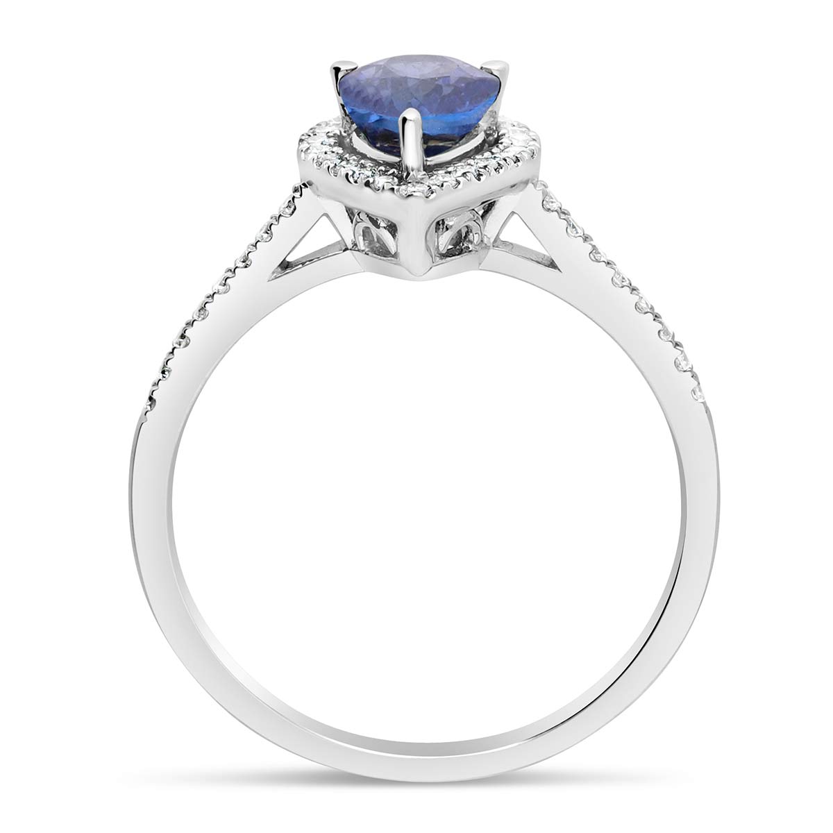 Bague de fiançailles ornée d'un saphir central taillé en poire inséré dans un halo de diamants HSI. L'anneau en or 18 carats (750/1000) est serti de diamants HSI en demi tour.