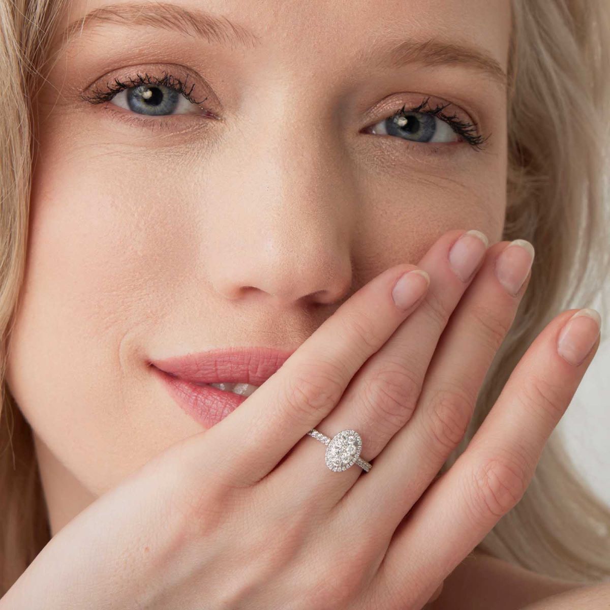 Bague de fiançailles en or 750/1000 ornée d'un pavage ovale de diamants HSI au centre. Des diamants sont également sertis sur la partie supérieure de l'anneau. Le poids total de diamant est de 0,48 ct. Les dimensions de la bague sont de 10,8 mm sur 6,6 mm au centre et 2 mm à l'anneau.