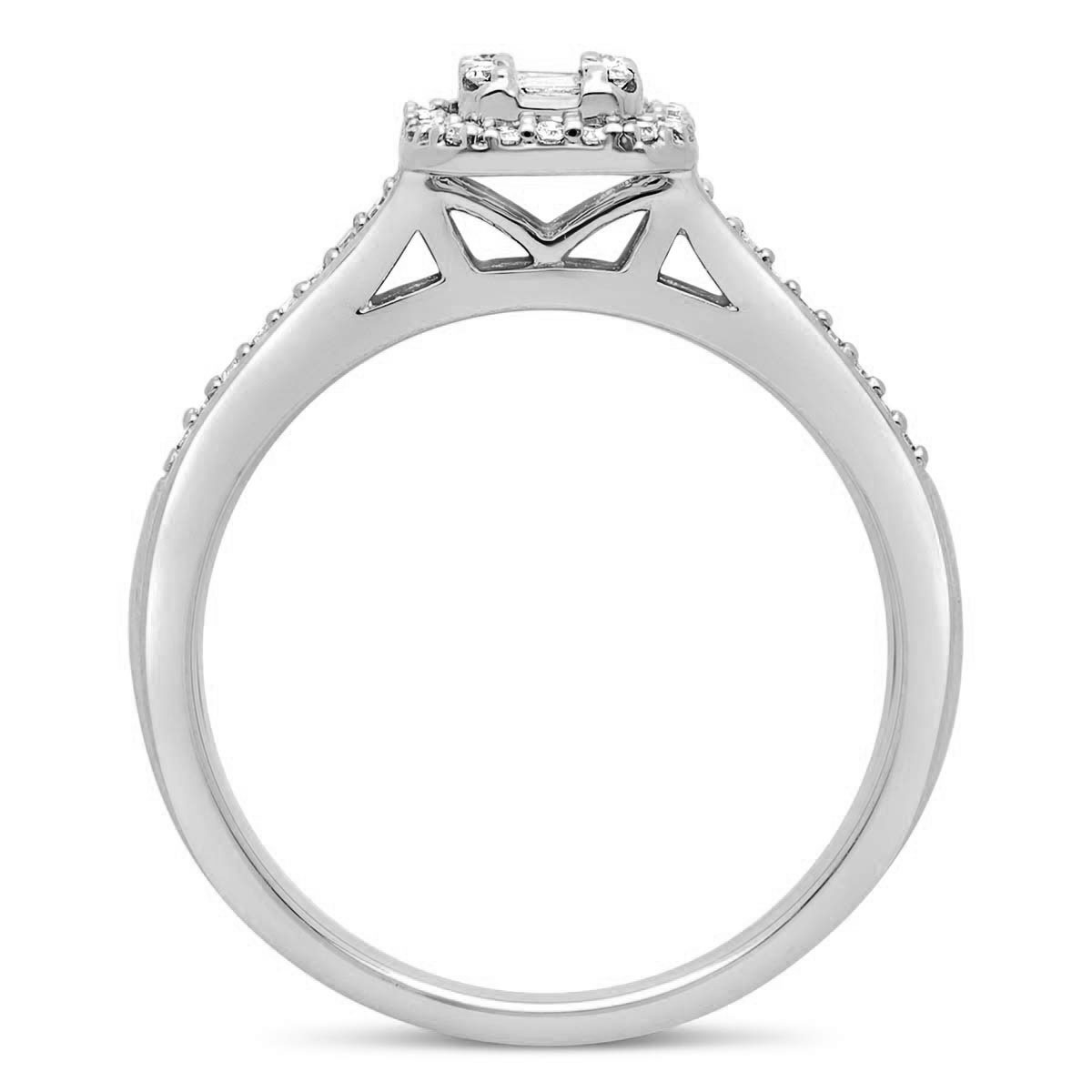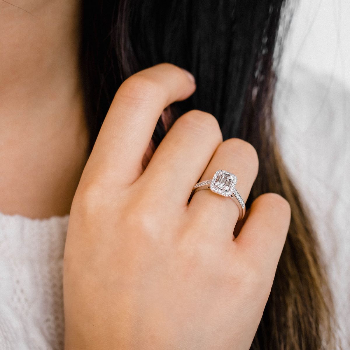 Une bague de fiançailles en diamants naturel HSI et en or 750 millièmes. Son centre de 8,8 mm sur 7,4 mm est composé de diamants taille baguette sertis de manière à créer l' illusion d'une taille émeraude, et entouré de diamants sertis en grains. Le corps de 2,4 mm de largeur est pavé sur sa partie supérieure de diamants sertis en grains.