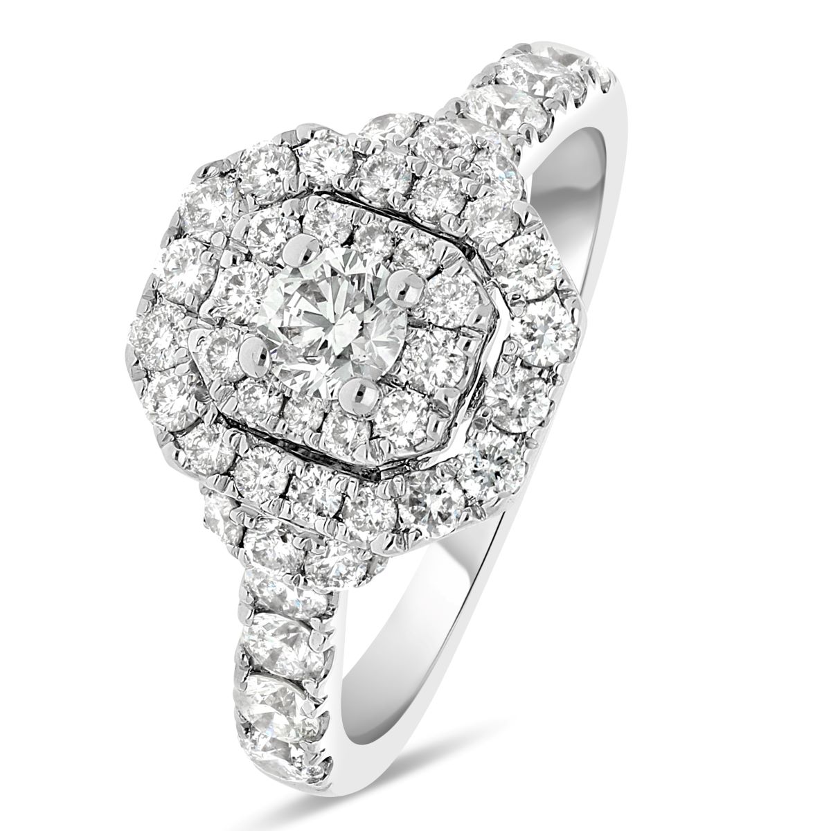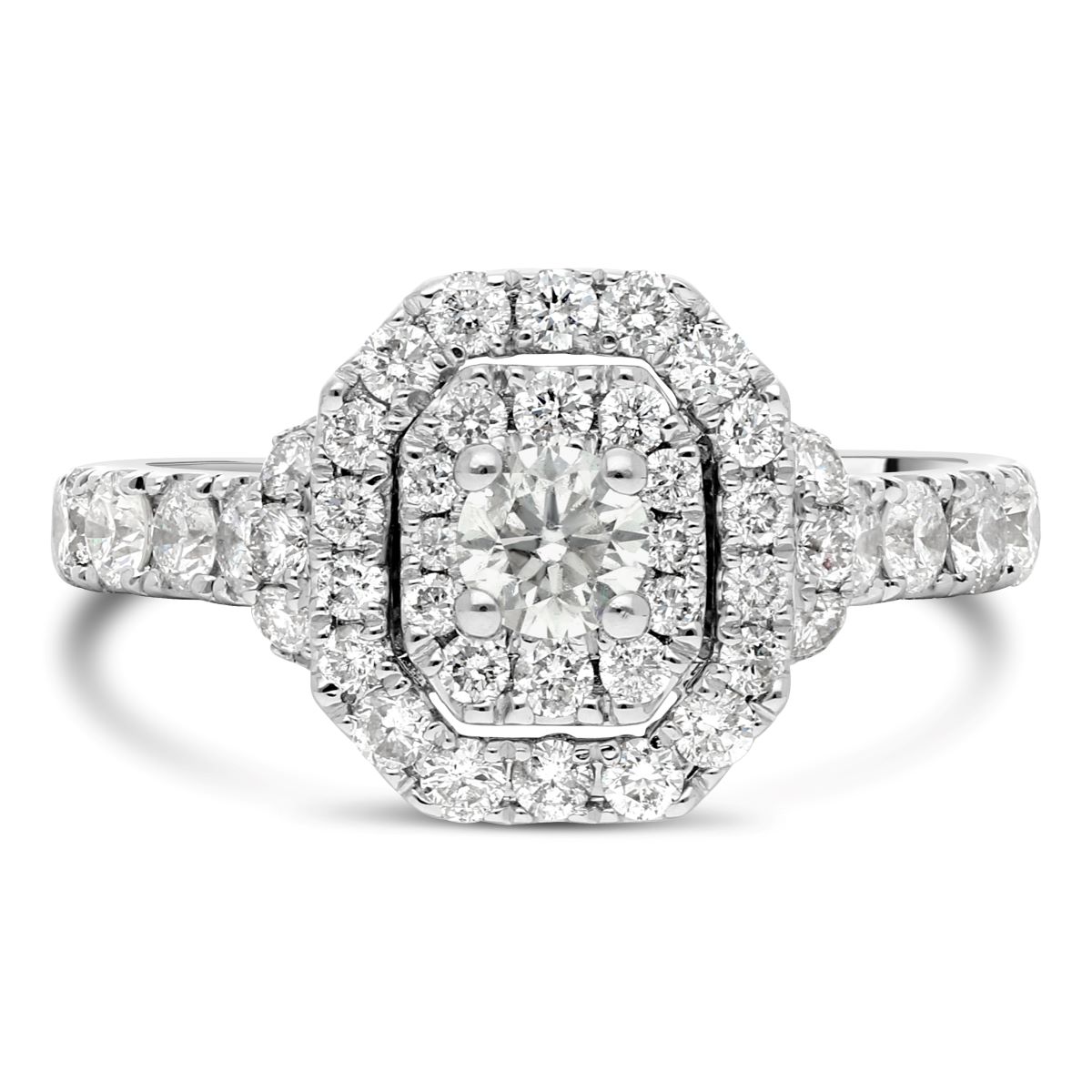 Une bague de fiançailles en or 750 millièmes (18 cts) composée d'un solitaire accompagné d'un pavage de diamants en forme émeraude (la longueur de 11 mm et la largeur est de 9,8 mm) et d'un anneau avec diamants. La largeur de l'anneau est de 2,6 mm. La pierre de centre en diamant est de 0,23ct, les diamants qui subliment le diamant central sont d'un poids total de 0,98 cts et de qualité H (couleur) et SI (pureté).