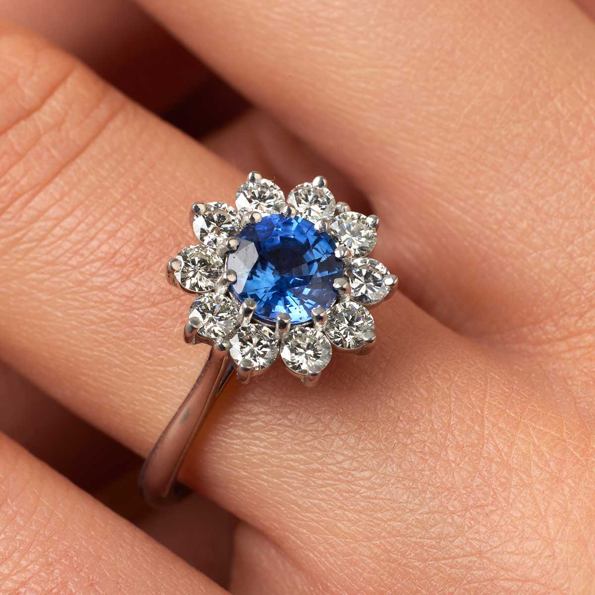 Bague de fiançailles de style marguerite en or 750 millièmes (18 carats), ornée en son centre d'un saphir rond, entouré de 10 diamants taille brillant de couleur G et pureté VS.