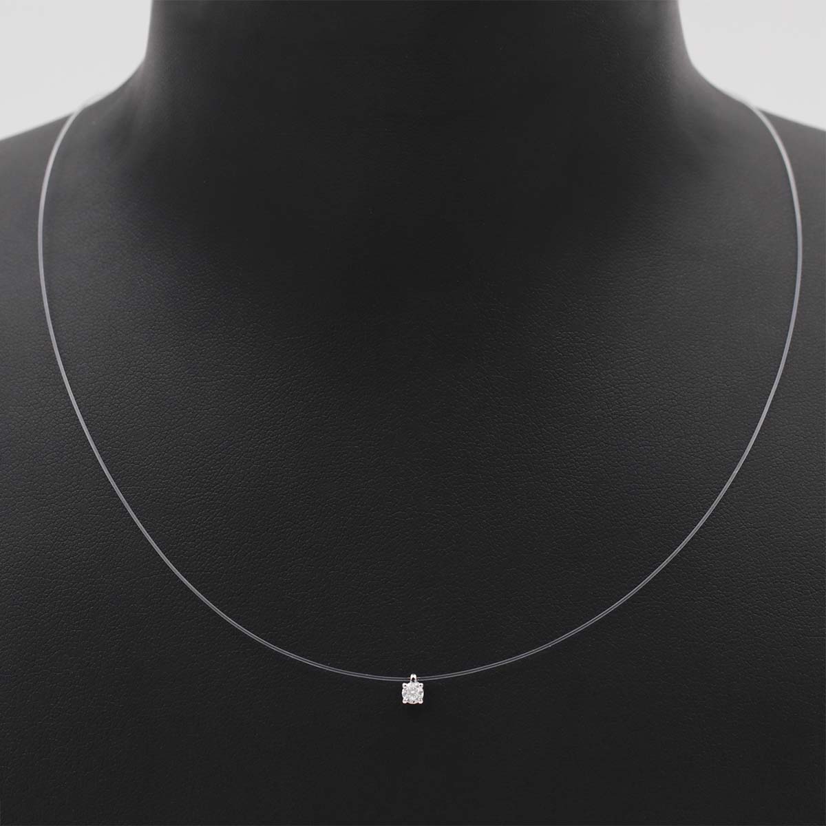 Collier diamant 0,10 HSI serti griffes de 3,0 mm de diamètre, monté en or 750/1000. Le collier est maintenu sur un fil de nylon de 42 cm de longueur.